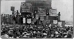 Keir Hardie, der Führer der Labour Party teilte der Versammlung mit (unter dem Zischen von mehreren liberalen Frauen auf der Rednerbühne), falls die Frauen das Wahlrecht gewinnen würden, würden sie es der „Kampfbrigade der Suffragetten“ verdanken.[30][31] Er befürwortete nachhaltig die Resolution der Versammlung, die auch verabschiedet wurde, dass nämlich den Frauen das Wahlrecht auf derselben Grundlage wie den Männern gegeben werden solle[32] und er verlangte eine Gesetzesvorlage in der laufenden Sitzungsperiode des Parlaments.[33]