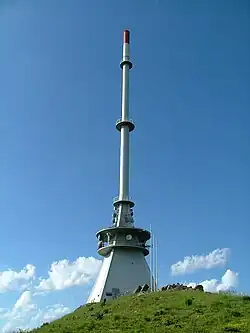 Rund 830 Meter nordnordwestlich des Gipfels der Mugel befindet sich auf 1433 m die Sendeanlage Mugel (Lage), eine Sendeanlage für Hörfunk und TV mit einem 88 Meter hohen Sendeturm. Der Sendeturm hat eine ähnliche Bauweise wie der Sendeturm des Senders Ochsenkopf.