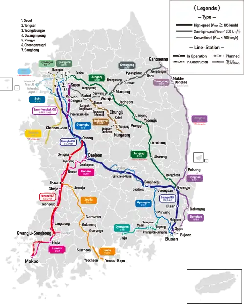 Das Eisenbahnnetz in Südkorea wurde in Normalspur (1435 mm) errichtet. 2023 hatte es eine Länge von 4018 km. 656 km davon waren Strecken des Hochgeschwindigkeitsverkehrs.[17] Es gibt zwei Arten von Schnellfahrstrecken. Sie werden entweder für eine Höchstgeschwindigkeit von 350 km/h ausgelegt (wobei sie planmäßig aber nur 300 km/h befahren werden[18]). Oder die Strecken werden für eine Höchstgeschwindigkeit von 200 km/h gebaut.[19]