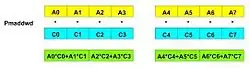 Der Befehl PMADDWD multipliziert vier Paare von 16-Bit-Worten und addiert paarweise die Ergebnisse auf.