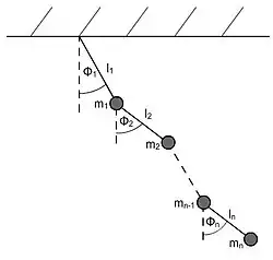 {\displaystyle L(\varphi _{1},...,\varphi _{n},{\dot {\varphi }}_{1},...,{\dot {\varphi }}_{n})={\frac {1}{2}}\sum _{k=1}^{n}m_{k}\left[\left(\sum _{i=1}^{k}l_{i}{\dot {\varphi }}_{i}\cos \varphi _{i}\right)^{2}+\left(\sum _{i=1}^{k}l_{i}{\dot {\varphi }}_{i}\sin \varphi _{i}\right)^{2}\right]+g\sum _{k=1}^{n}\sum _{i=1}^{k}m_{k}l_{i}\cos \varphi _{i}}