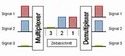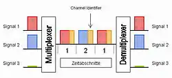 - Mehrere Signale werden zeitversetzt übertragen. Sie sind zeitlich ineinander verschachtelt. Die Zeitfenster können synchronisiert und gleich lang oder asynchron und bedarfsabhängig sein.