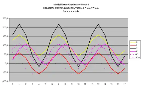 v heißt deshalb Akzelerator („Beschleuniger“) und nicht Multiplikator, weil die Investitionen nicht einfach proportional zur Gesamtnachfrage sind, sondern proportional zur Veränderung der Nachfrage. Dieser Akzelerator ist in Verbindung mit Time lags, also mit zeitlichen Verzögerungen mathematisch für die Zyklen verantwortlich.