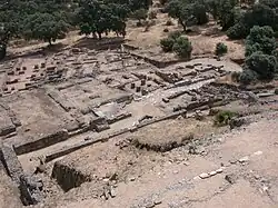 Die ersten systematischen Kampagnen zur Untersuchung der allgemein „Castillo de Mulva“ genannten Anlage wurden 1956 durch die Abteilung Madrid des Deutschen Archäologischen Instituts unter der Leitung von Wilhelm Grünhagen gestartet und konzentrierten sich hauptsächlich auf die Grabung und Dokumentation der öffentlichen Bauten auf dem Stadthügel, der Thermen am östlichen Abhang und ab 1957 auch der vorrömische Besiedlung des Hügels.[10] Daneben wurde auch bis einschließlich 1958 die im Osten des Hügels gelegene Nekropole untersucht.