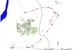 Das Forum befindet sich im unteren Bereich des Stadthügels. Aufgrund des abschüssigen Geländes musste nach Osten hin eine große Stützmauer errichtet und die vorgesehene Fläche terrassenförmig mit Erde aufgeschüttet werden. Der Grundriss ist nicht mehr klar feststellbar, da der Abbruch von Stützmauern, gerade auf der Ostseite, die Mauern aus der ursprünglichen Richtung in die umgebende Erde gedrückt hat und die heute messbaren Abstände daher nicht den antiken entsprechen. Es lässt sich jedoch ein klares Zentrum erkennen, auf dem eine Portikus einen kleinen Platz umschließt.[31] Die Mauer hatte ursprünglich eine Höhe von fast 5 Meter und eine Dicke von etwa 1,20 Meter. Es lassen sich zwei Bauphasen feststellen. Die älteste umfasst den Portikusbereich, wohingegen die jüngere auf der Südseite angebaut ist. Die ältere besteht aus Bruchsteinen, die teilweise gut vermörtelt, an anderen Stellen lediglich trocken gesetzt wurden. Die beiden Mauern wurden durch einen starken gelben Eckziegelpfeiler verbunden.[32]