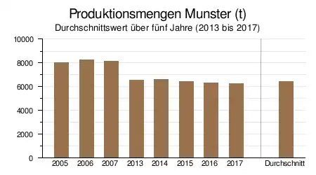 Der Munster gehört zu den beliebtesten Käsesorten Frankreichs und ist heute der Käse mit der sechstgrößten Produktionsmenge im Land.[14] Nach Angaben des Institut national de l’origine et de la qualité (INAO) werden pro Jahr etwa 6500 Tonnen Munster produziert (Stand 2017); die Produktionsmengen nahmen von mehr als 6600 Tonnen 2014 auf etwa 6300 Tonnen 2017 leicht ab. Im Vergleich zu den Produktionszahlen der Jahre 2005 bis 2007 mit jeweils über 8000 Tonnen pro Jahr sind die Produktionsmengen deutlich zurückgegangen.[19][20][21] Zu den größten Produzenten zählen Fromagerie de l’Ermitage sowie die Sodiaal-Konzerntöchter Les Fromageries de Blâmont und Compagnie des Fromages & RichesMonts.[22]