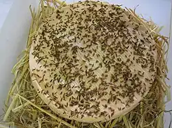 Anschließend wird der Bruch mit Hilfe von casseroles ausgeschöpft und in die Käseformen gebracht. Teilweise wird beim Ausschöpfen Kümmel in die Bruchmasse gegeben, um den Munster au cumin herzustellen.[8] Traditionell wurden als Käseformen perforierte Holzformen, Trotten, mit einem Durchmesser von 15 bis 18 Zentimetern und einer Höhe von 8 bis 10 Zentimetern, einem Durchmesser von 20 bis 22 Zentimetern und einer Höhe von 30 Zentimetern oder einem Durchmesser von 36 bis 40 Zentimetern und einer Höhe von 15 bis 18 Zentimetern benutzt, die teilweise mit Tüchern ausgelegt wurden. Mittlerweile sind diese durch Formen aus verzinntem oder emailliertem Eisenblech ersetzt. Nach etwa 5 bis 6 Stunden werden die Laibe zum ersten Mal gewendet und nach weiteren 5 bis 6 Stunden in neue Formen umgeformt oder die Formen werden gereinigt, um Verstopfungen der Perforierung zu entfernen. Insgesamt werden die Käselaibe am ersten Tag viermal gewendet und das Ablaufen der verbliebenen Molke erfolgt während der ersten drei bis vier Tage. Dabei werden die Käse bei Temperaturen von 18 bis 22 °C gelagert, im Winter in Talkäsereien auch kälter bei 15 bis 20 °C.[8] In Saulxures werden am vierten Tag, nach dem Abfließen der Molke, für einen Tag jeweils zwei bis drei Laibe übereinander in eine einzelne Form gelegt, sodass die letzten Reste der Molke durch ein leichtes Pressen ausgetrieben werden.[8]