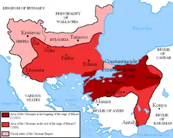 Die Einnahme des byzantinischen Adrianopel im Jahr 1363, gefolgt von weiteren Eroberungen, brachte in der Reaktion ein vorwiegend serbisches Heer unter dem König von Ungarn zusammen, aber Murads Feldherr Lālā Schahin, der erste Beylerbey von Rumelien, besiegte die Verbündeten in der Schlacht an der Mariza 1371, was auch zur Eroberung Makedoniens führte. Im Jahr 1366 wurde der König von Serbien bei Samakowo geschlagen und gezwungen, Tribut zu zahlen; eine Wiederaufnahme des Kriegs 1381 führte zur Eroberung von Sofia (Bulgarien) zwei Jahre später.