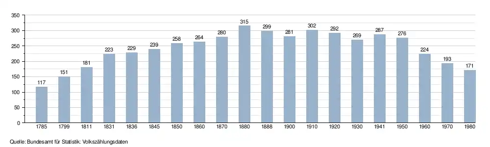 - ↑ a b Daten der Eidgenössischen Volkszählungen ab 1850 nach Gemeinden. (XLSX; 10 MB) Bundesamt für Statistik, Neuchâtel, 12. Juli 2024, abgerufen am 12. September 2025 (Öffnung in Excel nur über "Anhang/Excel-Datensatz" möglich).