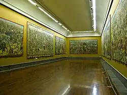 Der Saal 62, auch bekannt als Gobelinsaal, beherbergt die Wandteppiche der Schlacht von Pavia, die zwischen 1528 und 1531 auf der Grundlage von Kartonen von Bernard van Orley ausgeführt und in Brüssel[5]:S. 356 gewebt wurden, wie die Initialen des Gobelinmachers William Dermoyen zeigen. 1531 wurden sie von den Brüsseler Generalstaaten dem Kaiser Karl V. geschenkt; 1571 wurden sie Teil der Sammlungen von Francesco Ferdinando d’Avalos, bis sie 1862 von Alfonso d’Avalos dem italienischen Staat geschenkt und von dort in das Capodimonte-Museum überführt wurden[6]:S. 250. Die Titel der sieben Stücke lauten: