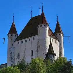 - Von den Ecktürmen aus bietet sich eine weite Aussicht über die Stadt, den Thunersee und zu den Alpen.