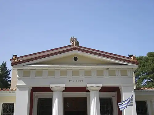Das klassizistische Gebäude des Museums wurde von den deutschen Architekten Friedrich Adler und Wilhelm Dörpfeld entworfen, deren Namen mit den im Jahr 1875 begonnenen Ausgrabungen in Olympia verbunden waren. Der Bau wurde mit durch eine Spende des Mäzens Andreas Syngros, zu dessen Ehren er „Syngreion“ genannt wurde, ermöglicht und im Jahr 1888 fertiggestellt. Das Gebäude beherrscht einen Hügel etwa 400 Meter nordwestlich der Altis, jenseits der Brücke über den Kladeos. Es beherbergte bis Ende der 1970er Jahre das Archäologische Museum Olympia. In der zentralen Halle waren die Skulpturen des Ost- und Westgiebels des Zeustempels und die Metopen, in der Halle standen ferner die Statuen der Nike des Paionios und des Hermes des Praxiteles. Die restlichen Säle beherbergten verschiedene Funde aus dem Heiligtum wie Bronzen und Skulpturen.