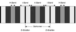 Eine Muskelfibrille besteht aus Hunderten hintereinandergeschalteten Baueinheiten mit gleichem inneren Aufbau, den Sarkomeren. Betrachtet man eine Muskelfibrille mit dem Lichtmikroskop, so wird eine typische Querstreifung sichtbar, die durch die regelmäßige Verteilung der Muskelfilamente verursacht wird. Es entsteht ein typisches Bandenmuster.