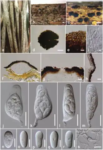 Muyocopron castanopsis. a–c.Oberflächiche Fruchtkörper auf dem Substrat. d–e. Gequetschtes Präparat, dass die Fruchtkörperwände zeigt. f. Schnitt durch ein Ascoma. g. Ostiole h. Peridium. i. Pseudoparaphysen. j–m. Schläuche. n–r. Ascosporen. s. Sporenkeimung.