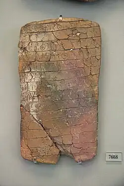 - ↑ V. Aravantinos, A. Vasilogamvrou: The first Linear B documents from Ayios Vasileios (Laconia). In: P. Carlier et al.: Études Mycéniennes 2010. Biblioteca di «Pasiphae» X, Pisa/Rom 2012, ISBN 978-88-6227-473-9, S. 41–54.