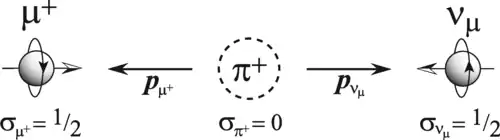- Vorwärtsemittierte Myonen: Das Myon wird in Flugrichtung des Pions emittiert. Im Ruhesystem des Pions addieren sich die Impulse von Pion und Myon. Der Myonenimpuls im Laborsystem ist somit größer als der des emittierenden Pions und besitzt die gleiche Richtung wie im Ruhesystem. Die Orientierung der Spinpolarisation bleibt damit erhalten: Vorwärtsemittierte Myonen sind rückwärts polarisiert.
