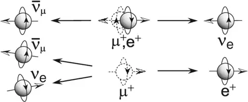 - die eindeutige Rechtshändigkeit (Chiralität , d. h. Spin parallel zum linearen Impuls) des Myon-Antineutrinos
