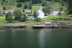 Auf beiden Seiten des Fjordes liegen einige wenige kleine Siedlungen und Höfe wie Styvi und Dyrdal, die ausschließlich vom Wasser aus zu erreichen sind. Am westlichen Ufer befindet sich das Dorf Bakka mit der 1859 erbauten Kirche. Bakka ist über eine Straße mit Tunnel von Gudvangen aus erreichbar. Viele der Gebäude auf Bakka sehen genauso aus, wie sie im 19. Jahrhundert und früher gebaut wurden. Dieser ganzheitliche Eindruck hat einen hohen Stellenwert. Bei Bakka finden wir den Ortsnamen „Kolmilebakken“, der von der Herstellung von Holzkohle zeugt.[4]