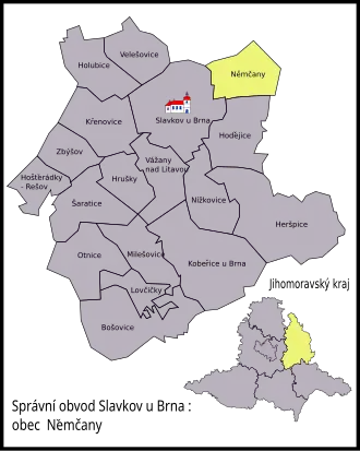 Zwischen 1949 und 1959 gehörte Němčany zum Okres Slavkov und kam nach dessen Aufhebung wieder zum Okres Vyškov zurück.