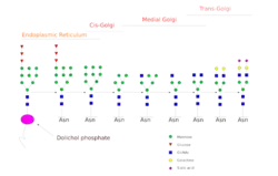 Die Synthese des N-Glykosylierungsvorläufers erfolgt durch verschiedene Transferasen an Dolicholpyrophosphat im Endoplasmatischen Retikulum. Der Vorläufer wird nach der Synthese en bloc auf das Protein durch die Oligosaccharyltransferase übertragen.[2] Nach der Übertragung werden die Glucosereste durch Glucosidasen und zum Teil Mannosereste entfernt, sodass das Grundgerüst übrig bleibt.[3] Das erste Kohlenhydrat an der Aminogruppe eines glykosylierten Asparagins ist ein N-Acetylglucosamin (GlcNAc) in β-Konfiguration.[1] Darauf folgen ein weiteres N-Acetylglucosamin und drei Mannosen (Man) als Grundstruktur der N-Glykosylierung, an der anschließend verschiedene Modifikationen erfolgen. Das Protein gelangt über den sekretorischen Weg für die anschließenden Modifikationen in den Golgi-Apparat. Dort entsteht aus der Grundstruktur ein hochmannosylierter Typ, der Hybridtyp oder der Komplextyp.[4]