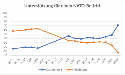 Nach dem russischen Angriff auf das Land sprachen sich im Jahr 2023 zwischen 80 und 92 % der Befragen für einen NATO-Beitritt aus.[43]