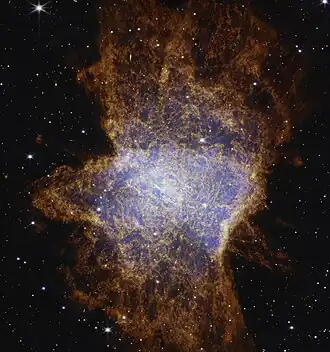 | Aufnahme im nahen Infrarot mithilfe des James Webb-Weltraumteleskops, die im Nebel entstandenen Moleküle erscheinen orange. | |