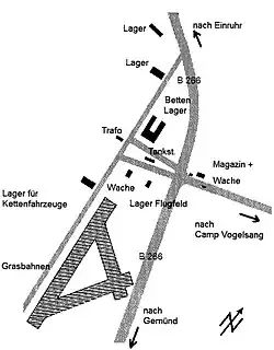 Ehemaliges Flugfeld Vogelsang (Graspisten) für leichte Flugzeuge und Helikopter der belgischen Armee (bis 2006). Dieses Flugfeld (1934–1939 erbaut) wurde schon von der Wehrmacht genutzt und war auch in Gebrauch im Westfeldzug. Ende 1944 wurde für kurze Zeit eine Messerschmitt-Jagdflugzeugstaffel auf Vogelsang stationiert. Transportmaschinen landeten, um Verletzte zu dem in Vogelsang eingerichteten Lazarett zu bringen.[20]