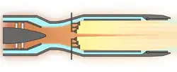 Der Schubrohrquerschnitt ist meist deutlich größer als der Düsenquerschnitt und soll den Druckverlust in der Strömung verringern. Die Zündung des Kraftstoffes erfolgt meist durch: