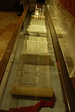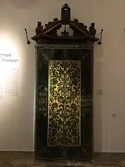 Unterhalb der Inschriftentafel sind die Türen des Torahschreins von 1843 aus der Grande Sinagoga italiana zu Mantua, die italienische Faschisten 1938 sprengten. Die Türen mit mittiger Darstellung der Gesetzestafeln des Bundes vom Berge Sinai krönt das Relief eines Keter Torah.[29] Beiderseits des Keters und am Fuße des Torahschreins befanden sich zusätzliche Reliefs von Tempelgefäßen. Zwischen beiden Fenstern dieses Saals hängt die Parochet Tedesca von 1572 aus Ferrara,[30] die älteste erhaltene der Welt.[29]
