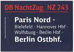 Zuglaufschild eines eingestellten Nachtzuges der DB