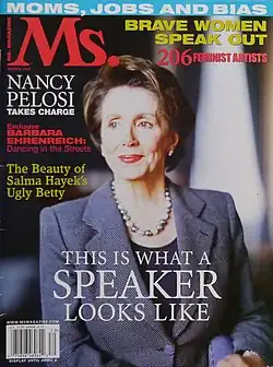 Pelosi erarbeitete sich den Ruf einer gewieften Politikerin und stieg in der Führungsriege der Demokraten im Repräsentantenhaus auf; 2002 wurde sie zum Minority Whip, also zur Geschäftsführerin der Minderheitsfraktion, gewählt. 2003 wurde sie als Nachfolgerin Dick Gephardts demokratische Fraktionsvorsitzende und somit House Minority Leader, da sich die Demokraten zu dieser Zeit in der Minderheit befanden. Sie bemühte sich um die Einigkeit der verschiedenen Strömungen innerhalb ihrer Fraktion.[2] Mit Konstituierung des am 7. November 2006 gewählten 110. Kongresses am 3. Januar 2007 übernahm sie als erste Frau in der Geschichte der Vereinigten Staaten als Sprecherin die Führung des Repräsentantenhauses. Nach der Halbzeitwahl in der ersten Amtszeit Präsident Obamas 2010, bei der Pelosi sich in ihrem Wahlkreis mit 78 % der Stimmen durchsetzte, ihre Partei aber die Mehrheit verlor, musste sie ihr Amt als Sprecherin im Januar 2011 an den Republikaner John Boehner abgeben. Sie übernahm erneut den Vorsitz der demokratischen Minderheitsfraktion, den sie auch nach der Wahl 2016 behielt, obwohl sie von ihrem Kollegen Tim Ryan herausgefordert worden war. Nach der Niederlage bei der Präsidentschaftswahl 2016 insbesondere durch den Verlust vieler weißer Wähler aus der Arbeiterschaft hatten einige Demokraten Unzufriedenheit mit Pelosi geäußert.[2]