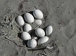 Die Hennen legen ihre goldgelben Eier in eine Nestgrube, die vom Hahn ausgelegt wird. Es handelt sich um eine Vertiefung in der Erde, die etwa 1 m breit und 12 cm tief ist. Am Ende befinden sich 13 bis 30 Eier, in sehr seltenen Fällen bis zu 80 Eier im Nest. Nachdem die Hennen die Eier gelegt haben, ziehen sie weiter. Stoßen sie auf das Territorium eines anderen Hahns, wiederholt sich dort das Ganze. Das Männchen bleibt allein zurück und ist demnach für das Brutgeschäft verantwortlich. Während der 35 bis 40 Tage währenden Brutzeit ist es extrem aggressiv gegenüber allen Eindringlingen gleicher oder anderer Art. Dieses Verhalten trifft auch Nachzügler unter den Hennen, die erst jetzt zum Ablegen der Eier kommen. Da sie durch den Hahn nicht zum Nest vorgelassen werden, müssen sie die Eier außerhalb des Nests ablegen. So gibt es in beinahe jedem Nandu-Territorium zahlreiche Eier, die das Nest ringförmig umgeben und verrotten. Diese scheinbare Verschwendung hat jedoch ihren Nutzen: Die verfaulenden Eier locken Fliegen an, die dem unabkömmlichen Männchen während der Brut als Nahrung dienen. Ab und zu brütet ein Paar von zwei Hähnen, eng nebeneinander sitzend, seine Eier gleichzeitig aus und zieht dann die Jungen gemeinsam auf.[7]