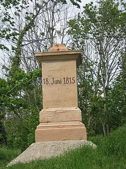 Der Stein war zu Ehren von Gebhard Leberecht von Blücher, ab 1814 Fürst Blücher von Wahlstatt, Königlich preußischer Generalfeldmarschall, Sieger in der Schlacht von Waterloo (seiner Zeit als Schlacht von Belle-Alliance bekannt) von einem Amtmann Schmidt aus Bad Kösen, im Jahr 1865 errichtet worden. Die Inschriften „18. Juni 1815“ und „W R“ für Wilhelm Rex (Wilhelm I., König von Preußen) sind noch zu erkennen.[1][2][3][4]