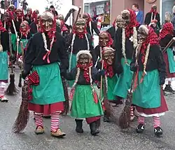 Die Hexen tragen einen weinroten Rock mit schwarzer Bluse und grüner Schürze sowie Strohschuhe. Die ausdrucksstarke dunklen Holzmaske ist gleichermaßen grimmig wie freundlich.