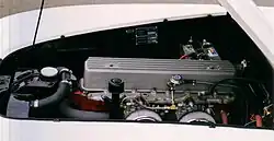 Der von Healey überarbeitete Nash Dual Jetfire Six Motor mit Aluminium-Zylinderkopf und den beiden seitlich angebrachten SU-Vergasern im Vordergrund