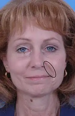 Als Nasolabialfalte oder Nasenlippenfurche (Sulcus nasolabialis, von lateinisch nasus „Nase“ und labium „Lippe“) wird jene Weichteilvertiefung bezeichnet, die beidseits vom oberen Ende der Nasenflügel neben die Mundwinkel zieht. Sie wird auch „Marionettenmund“ genannt. Früher wurde sie auch als „Kummerfalte“ bezeichnet. Form, Tiefe und Länge der Nasolabialfalte werden durch die Gesichtsmuskulatur, das unterschiedliche Ausmaß des vorhandenen Unterhautfettgewebes und das Alter bestimmt. In der Tiefe der Falte liegt ein Lymphknoten, der Nodus nasolabialis.[1]