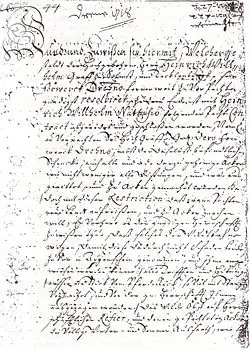 - ↑ im Einzelnen waren die Taufkinder: 25. Februar 1688, Christian Michael Lehmann, Sohn des Custodis Gottfried Lehmann; 3. April 1694, Maria Hilges, Tochter des Peter Hillges; 21. September 1695, Elisabeth Dübigs, Tochter des Hüfners und Richters Hans Dübigs; 20. Oktober 1697, Johannes Richters, Sohn des George Richters; 28. März 1699, Peter Heenen, Sohn des Hüfners und Gerichts-Schöppen Hans Heenen