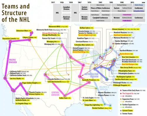 Grundlegende Änderungen brachte die Saison 1926/27. Nach der Auflösung der Ligen im Westen Kanadas wurde entschieden, dass der Stanley Cup nur noch in der NHL ausgespielt werden sollte. Mit drei weiteren Teams aus den Vereinigten Staaten, den New York Rangers, Chicago Blackhawks und Detroit Cougars, kamen nur noch vier der zehn Teams aus Kanada. Auch das Team aus Toronto hätte in die Vereinigten Staaten nach Philadelphia verkauft werden sollen, aber eine Gruppe um Conn Smythe übernahm das Team und benannte es in Maple Leafs um.[9] Erstmals wurde in zwei Gruppen, sogenannten Divisions, gespielt. In der Canadian Division spielten die vier kanadischen Teams und die New York Americans. Die weiteren fünf Teams spielten in der American Division. In der Saison 1927/28 waren die Rangers das erste US-amerikanische NHL-Team, das den Stanley Cup gewann. Die folgende Spielzeit 1928/29 stand im Zeichen der Torhüter. In den 220 Spielen kam es zu 120 Shutouts. Es fielen durchschnittlich nur 2,9 Tore pro Spiel.[10] Die NHL griff mit einer Regeländerung ein. Ab der Saison 1929/30 waren Pässe nach vorne, jedoch nicht über eine der beiden blauen Linien erlaubt.[2] Der Toreschnitt stieg auf 5,6 an und es gab nur noch 26 Begegnungen ohne Torerfolg. Im selben Jahr spielte Clint Benedict als erster Torwart mit Maske.[11] Der regelmäßige Spielerwechsel fand auch in den Regeln Berücksichtigung. Statt zwölf durften nun 15 Spieler im Kader stehen.