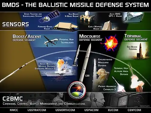 Während der Amtszeit von George W. Bush (US-Präsident von 2001 bis Januar 2009) wurde NMD weiterentwickelt und sollte vor Terroristen, so genannten Schurkenstaaten wie Iran und Nordkorea und vor versehentlich abgeschossenen Atomraketen schützen. Obwohl auch frühere Programme ein Erschüttern oder Beeinträchtigen der wechselseitigen Abschreckung gegenüber Russland und Volksrepublik China weder beabsichtigten (siehe Gesetzestext oben) noch dies technisch möglich ist (wegen der zu erwartenden Übersättigung, d. h. zu viel Rakete auf einmal, siehe unten) kritisieren beide Staaten seit Jahren diese als globales Wettrüsten mit Weltraumtechnologie.[3]