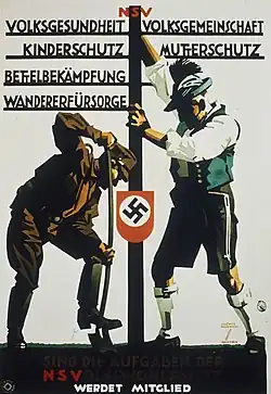 Die Nationalsozialistische Volkswohlfahrt (abgekürzt NSV), kurz NS-Volkswohlfahrt, war ein am 18. April 1932 gegründeter eingetragener Verein. Am 10. April 1935 wurde die NS-Volkswohlfahrt e. V. zu einem der NSDAP angeschlossenen Verband.[1] Ihr Leiter war Erich Hilgenfeldt. Der Sitz befand sich in Berlin-Wilmersdorf, dessen Gebäudekomplex von dem Architekten Hugo Constantin Bartels stammt.[2]