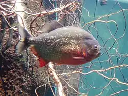 Pygocentrus nattereri spielt im neotropischen Süßwasser-Ökosystem[8] Südamerikas als Raubfisch eine bedeutende Rolle. Während der im Unterlauf des Amazonas auftretenden Springflut Pororoca und daraus entstehenden Tidenwelle, die sich von der Mündung landeinwärts ausbreitet, kann der Wasserstand um bis zu 15 Meter steigen. Durch das Hochwasser kommt es wiederholt zu einem massenhaften Ertrinken von Haus- und Wildtieren, die als Kadaver auf den Gewässern treiben und zu Seuchen führen können. Piranhas besetzen die ökologische Nische als Aasfresser und werden wegen dieses Verhaltens auch als „Hyänen“ oder „Geier des Süßwassers“ oder „Gesundheitspolizei“ bezeichnet.[9] Sie sind darauf spezialisiert, tote, verletzte oder kranke Tiere zu fressen, die sie in kleinen Gruppen angreifen.[10]