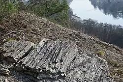Die aufgeschlossenen Gesteine zeigen hier, dass das Meer damals ziemlich salzhaltig und lebensfeindlich war. Daher wurden nur wenige aus dem offenen Ozean eingewanderte Lebewesen hier heimisch. Sichtbar ist eine Wechsellagerung von fossilarmen Wellenkalkpaketen mit sehr schalenreichen Gesteinsbänken. Harte und fossilreichen Kalksteine bilden dabei Steilstufen und Gesimse. Zusammen mit ihrem Fossilinhalt zeigen sie eine Gliederung der Schicht-Abfolge. Man bezeichnet diese als Stratigraphie (Leitbänke). Die oberste Steilstufe des Hanges bildet dabei der Leithorizont der Schaumkalkbänke. Diese bestehen aus Kalkkügelchen (Ooiden) und Schalenbruchstücken und wittern schaumig aus. Weitere sind die Spiriferina-Bank und die Terebratelbänke, die jeweils nach dort häufig auftretenden Armfüßern (Brachiopoden) benannt sind.