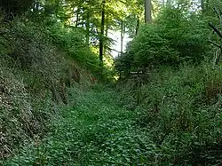 Alter Rotbuchenbestand mit bis zu 10 m hohen Felsen. Tief eingeschnittener Hohlwegteil des historischen Kriegerweges. Die großen Felsen sind moosreich.