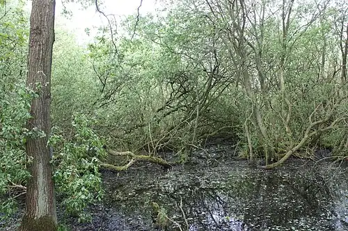 Die Ufer und die Verlandungszonen des Weihers sind dicht bewachsen, dabei geht ein massiver Seggengürtel in eine Wiesenbrachfläche und ein Weidendickicht in einen Bruchwald über. Durch die kleinteilig gegliederte Landschaft gibt es hier eine Vielzahl verschiedener Lebensräume. Um diese Kernzone herum wird, wenn auch extensiv, weiterhin Landwirtschaft auf durch Knicks getrennten Weide- und Ackerflächen betrieben. Der hierdurch bedingte Nährstoffeintrag ist für die Pflanzenwelt im und um den Weiher problematisch. Durch einen Entlastungsgraben und Wiedervernässung des Geländes wird seit geraumer Zeit versucht, die ursprünglichen nährstoffarmen Bedingungen wiederherzustellen.