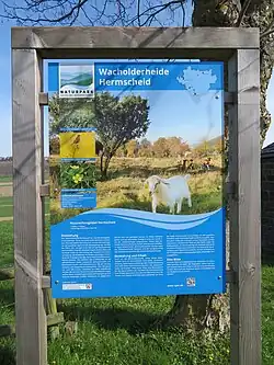 „Im Biotopverbund ist das Wacholdergebiet Hermscheid von landesweiter Bedeutung für Lebensgemeinschaften des strukturierten Magergrünlands. Dabei war das Wacholdergebiet Hermscheid in früheren Jahren eine Heidefläche, die sich erst im Zuge von Pflege- und Bewirtschaftungsmaßnahmen zu einem borstgrasrasenreichen, aber zwergstraucharmen Weidegebiet entwickelt hat.“