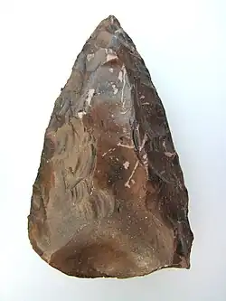 In Europa sind die Epoche des Moustériens und die in Levalloistechnik hergestellten Steinwerkzeuge mit den Neandertalern assoziiert, ferner sind Werkzeuge aus Tierknochen erhalten geblieben.[147] Universalwerkzeug zum Schneiden und Schaben war für die „klassischen“ Neandertaler der Würm- bzw. Weichsel-Kaltzeit das Keilmesser, zugleich typologische Leitform des Micoquien (heute: „Keilmesser-Gruppen“). Ein modernes Pendant dieser Gerätform, die sowohl zum Schneiden als auch Schaben eingesetzt wurde, ist bei den Eskimos mit dem Ulu überliefert.[148] Die Fundstellen von Werkzeugen, die während des Moustériens genutzt wurden, befinden sich oft nur fünf bis sechs Kilometer entfernt vom natürlichen Vorkommen des Gesteins, aus denen sie gefertigt wurden; aus diesem Befund wurde auf ein relativ kleines Aufenthaltsgebiet dieser Neandertaler-Gruppen geschlossen.[43] Andere Gruppen zogen über große Entfernungen zu Feuersteinvorkommen, um sich dort mit dem Rohmaterial zu versorgen. Manche Fundplätze waren Eckpunkte eines Streifgebietes von mehr als 100 km Durchmesser.[149]