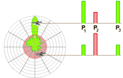 - setzt dagegen auf eine Kooperation der Transponder. Auch hier wird eine Antenne mit einer Rundstrahlcharakteristik neben der Richtantenne verwendet. Die beiden Abfrageimpulse (P1 und P3) werden über das stark gebündelte Diagramm der Richtantenne abgestrahlt, ein dritter Impuls, P2 genannt, mit dem Rundstrahler. Im Transponder wird nun untersucht, wie groß die Amplitude von P2 im Verhältnis zu P1 und P3 ist. Ist P2 kleiner als P1, dann empfängt der Transponder das Signal aus der Hauptkeule und muss antworten. Ist P2 größer oder gleich P1, dann empfängt der Transponder das Signal aus einer Nebenkeule und darf nicht antworten.