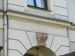 Über dem Eingang findet sich eine dreizeilige, mittig ausgerichtete Inschrift: