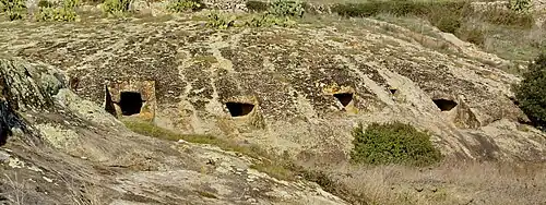 Die 12 in einer Reihe gelegenen und die beiden abseitigen Domus de Janas der Nekropole beeindrucken durch monumentale Architektur, vor allem im Zugangsbereich, mit hohen in den Hang gearbeiteten Dromoi. In den Felsengräbern finden sich interessante Details, wie beispielsweise in den Fels gehauene Bankaltäre und quadratische Wandnischen. In einem Grab stützt eine stehen gelassene Säule die Decke. Der Grundplan der Mehrheit der Gräber besteht aus einem Vor- und einem Hauptraum, während einige keine Vorkammer, aber mehrere Nebenkammern aufweisen.