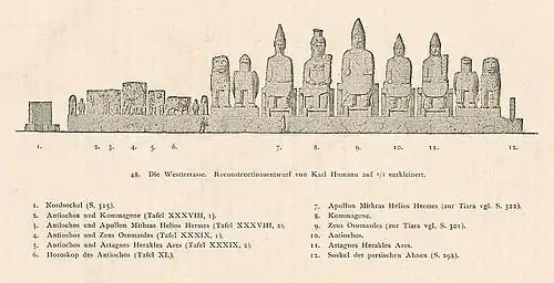 - ↑ Die Identifikation der Monumentalstatuen von Antiochos und Apollon durch Humann und Puchstein ist nach heutigem Wissensstand vertauscht.